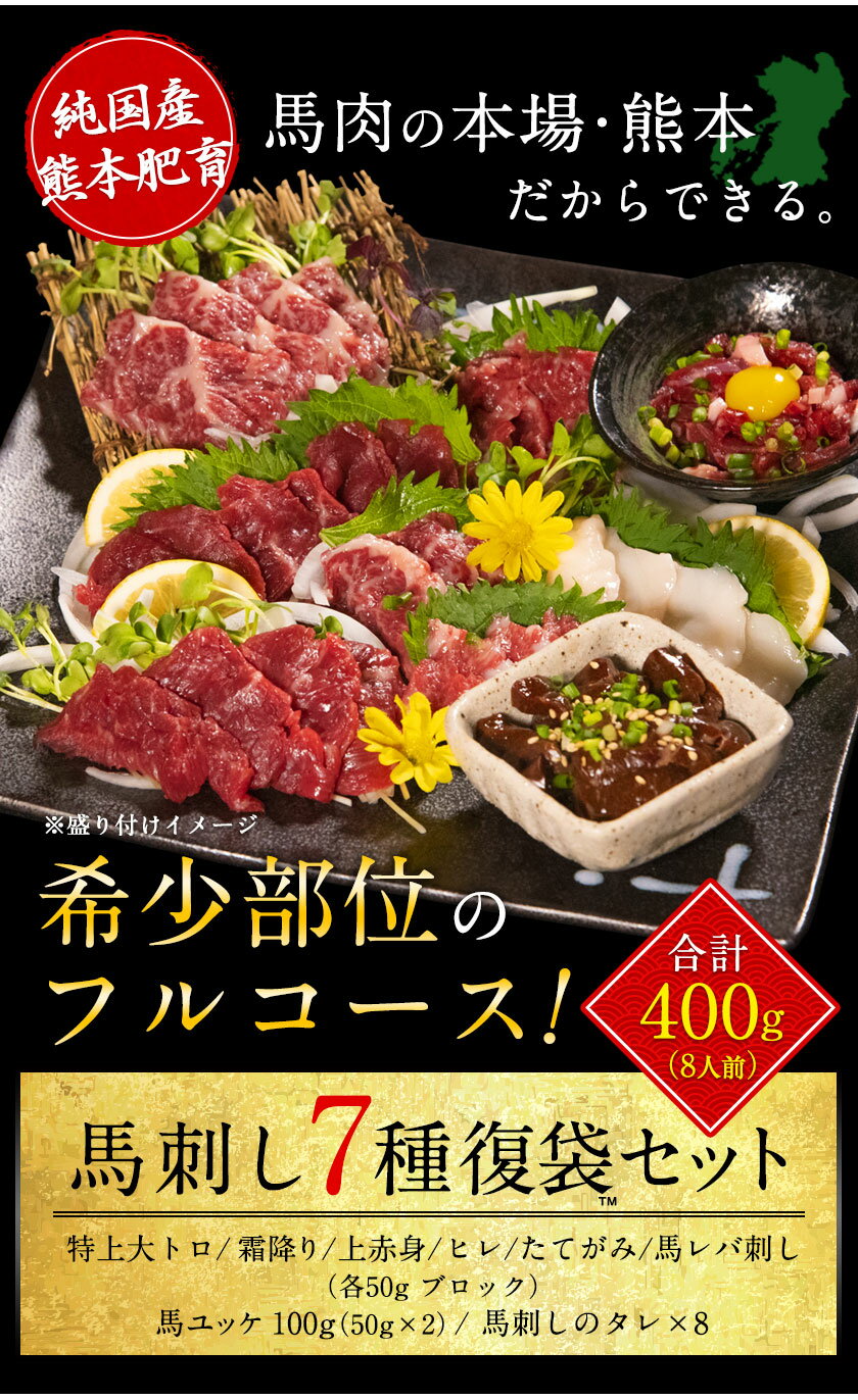 ■馬刺し7種復袋セット 名称 馬刺し詰め合わせ 産地・内容量 純国産熊本肥育 特上大トロ馬刺し 50g(ブロック) 純国産熊本肥育 霜降り馬刺し 50g(ブロック) 純国産熊本肥育 上赤身馬刺し 50g(ブロック) 純国産熊本肥育 ヒレ馬刺し 50g(ブロック) 純国産熊本肥育 たてがみ 50g(ブロック) 純国産熊本肥育 特撰馬ユッケ 100g(50g×2) 純国産熊本肥育 馬レバ刺し 50g(ブロック) 馬肉加工業者 熊本ミート販売株式会社 熊本県熊本市南区城南町下宮地906-1 販売者 くまもと風土 荒尾店 〒864-0033 熊本県荒尾市緑ケ丘1丁目1-1 賞味期限 外枠に記載 保存方法 -18度以下で冷凍 ■共通項目 お支払い方法 ■クレジットカード(手数料無料) ■銀行振込(前払入金/手数料:お客様ご負担) ■代金引換(手数料:一律330円) ■セブンイレブン前払い(手数料:無料) ■ローソン、郵便局ATM等 前払い(手数料:無料) ■コンビニ後払い(手数料:250円) 配送方法 ヤマト運輸、佐川急便、日本郵政の冷凍便でお届けさせていただきます。