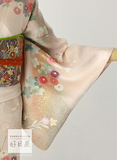 詳細やわらかいピンクベージュの綸子地に菊、梅、萩、桔梗を描いた、オーソドックスで若いミセスの方に最適な訪問着です。