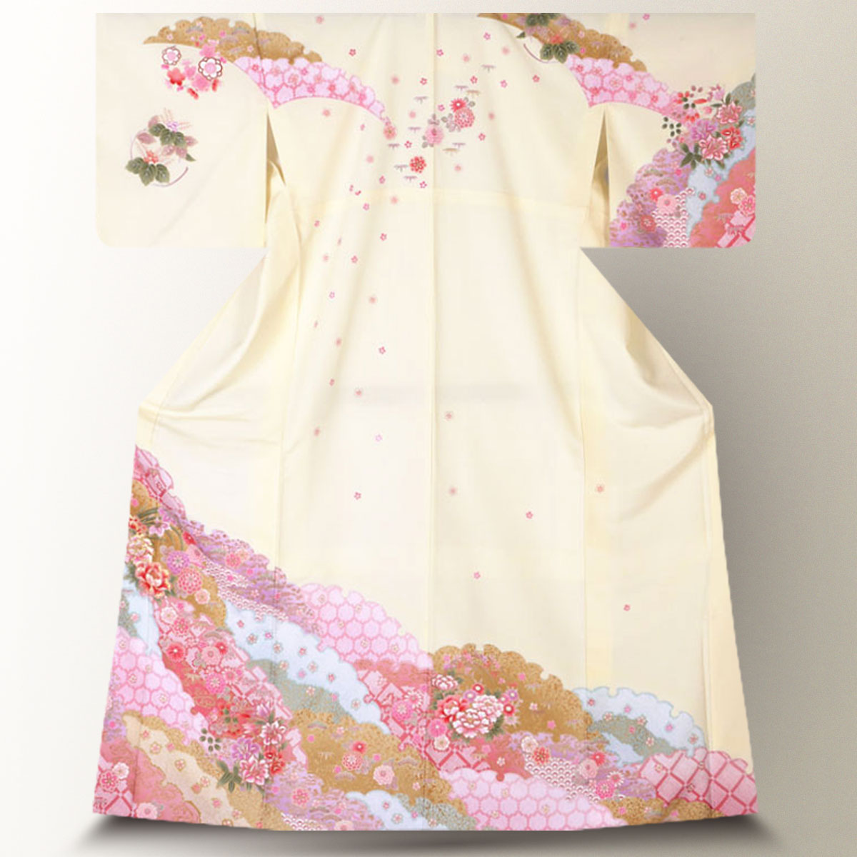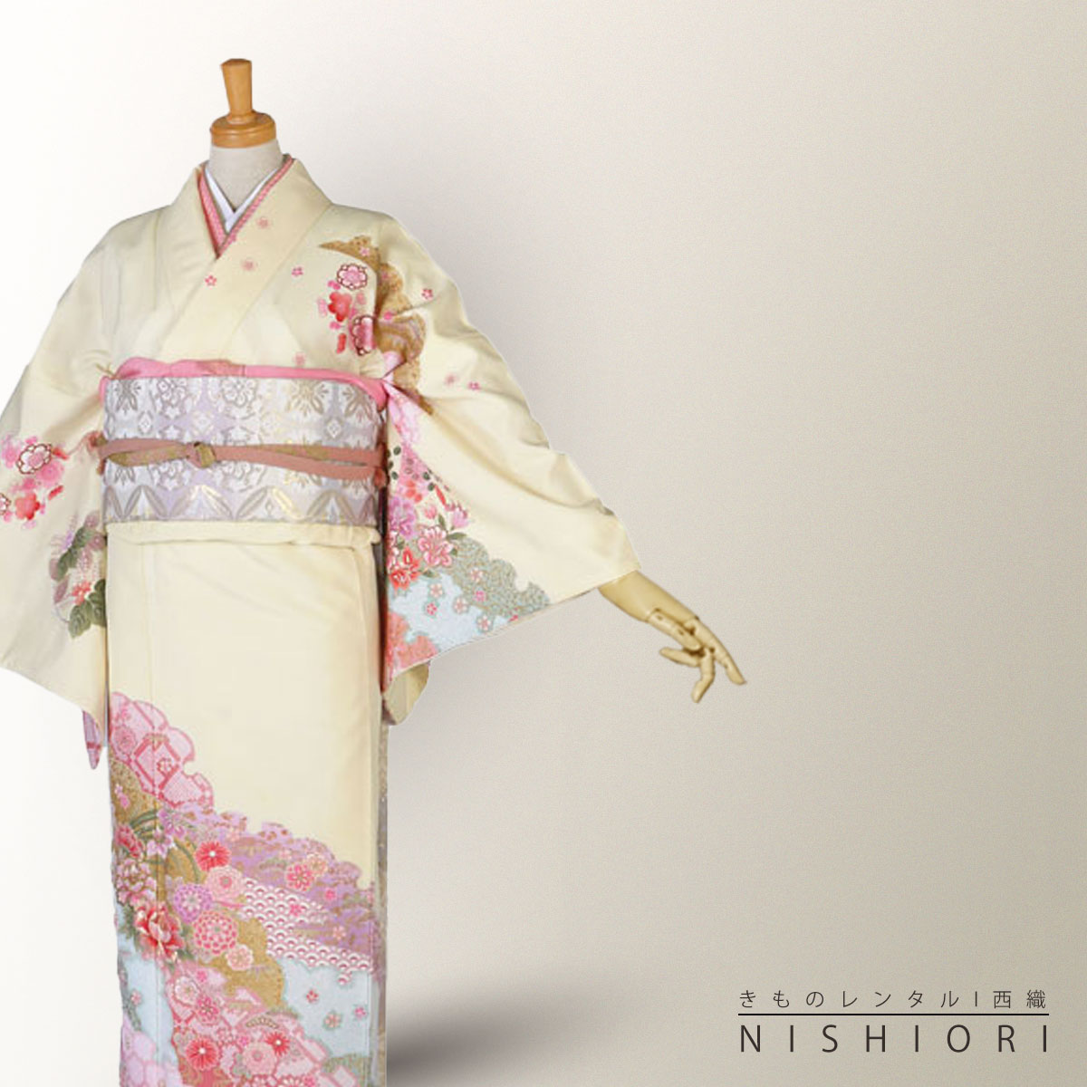 レンタル 訪問着 フルセット【卒業式 七五三 結婚式 お宮参り 訪問着 貸衣装】【フリーサイズ】【往復送料無料】黄 クリーム系 牡丹