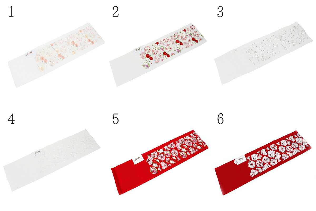サイズ 約110×16cm 色 1.白×ピンク 2.白×赤 3.白×白(金) 4.白×白 5.赤×赤 6.赤×白 7.白×菱×ピンク(花) 8.白×菱×白(花) 9.白×オレンジ(花・つぼみ) 10.白×ピンク(花・つぼみ) 11.白(花) 12.薄ピンク(花) 素材 本体:絹100% 刺しゅう糸:レーヨン100% 金属糸使用 商品写真に関してのご注意 できるだけ商品と同じ色目を出すよう努力しておりますが、表示画面等の違いから現物と色の違いが生じる場合がございます。