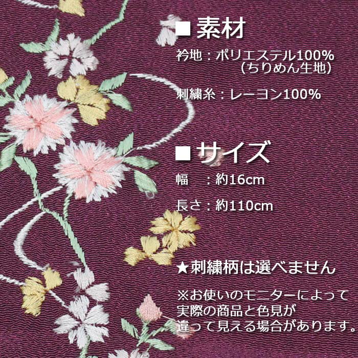 サイズ 長さ:約110cm×幅約16cm 素材 衿地:ポリエステル100%(ちりめん生地) 刺繍糸/レーヨン100% 製造 中国 配送 宅配便、または、メール便での発送となります。